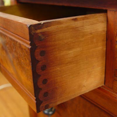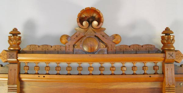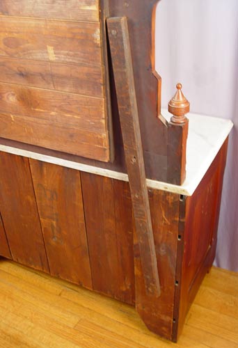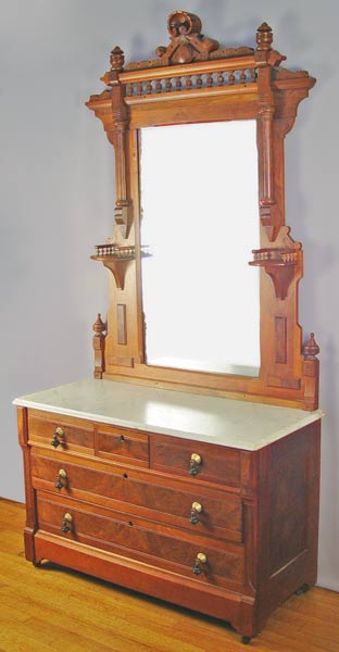 ORNATE RENAISSANCE REVIVAL VICTORIAN DRESSER WITH MIRROR: Carved and gingerbread crest over mirror. Beveled white marble top over 5 drawers. 3 over 2 full length. Approx. 75'' high x 45'' wide x 20 1/2'' deep. Looking glass is 39'' x 23''.