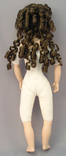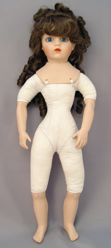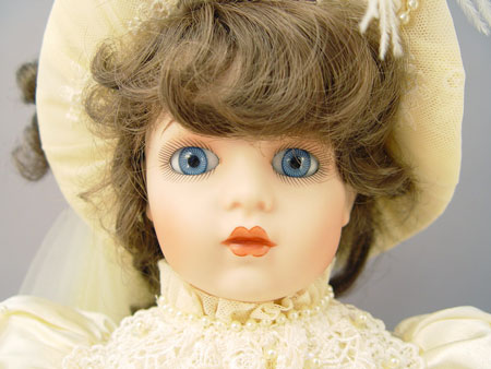 CONTEMPORARY BISQUE SHOULDER HEAD BRIDE DOLL: Unmarked modern bride doll dressed in a gown rich in detail of lace beads and sequins, and long veil from her hat. Stationary blue eyes, long curled brown hair, bisque arms and lower legs, cloth body. 22'' tall.