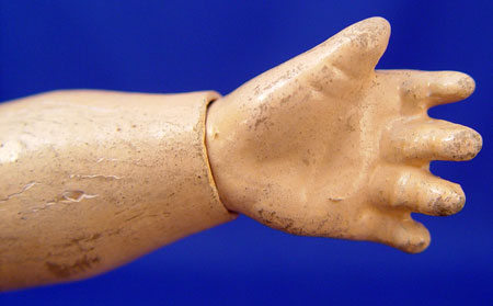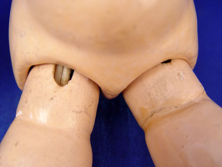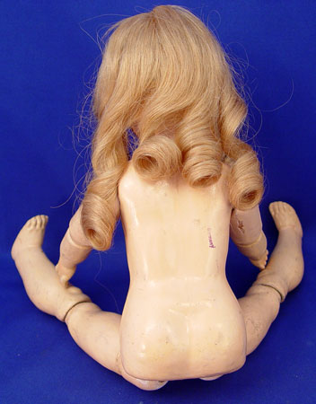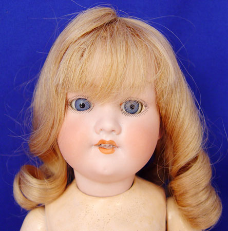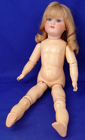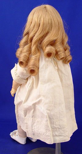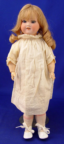 ARMAND MARSEILLE GERMAN BISQUE HEAD DOLL: ''Armand Marseille German 390n'' incised on neck. Stationary blue glass eyes, open mouth with teeth, French blond wig. Fully jointed body. Dressed in white cotton gown. 18'' high.