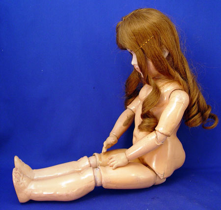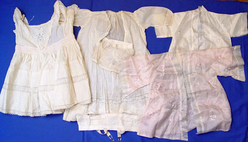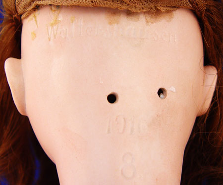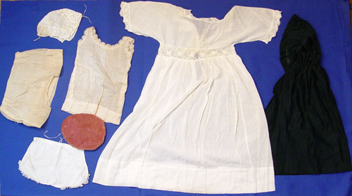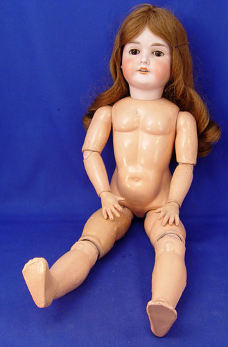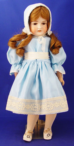 C M BERGMANN GERMAN BISQUE DOLL: Sleepy brown eyes, open mouth with four teeth, curled brunette wig, composition ball joint body, marked to back of head ''#109 Waltershausen German'', circa 1885. Sold with assorted doll and baby clothes.