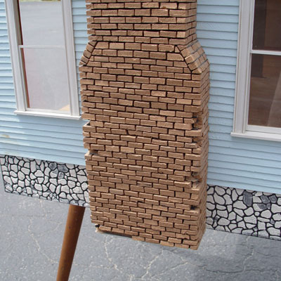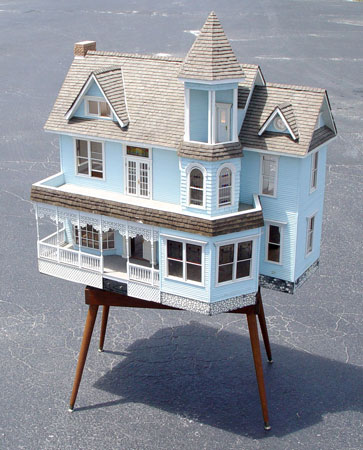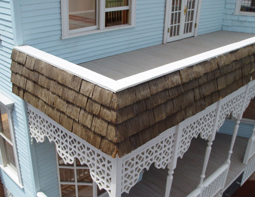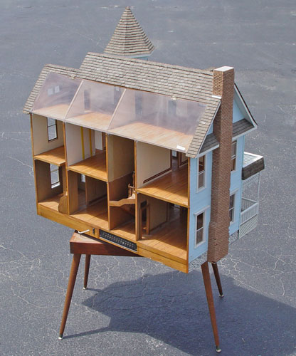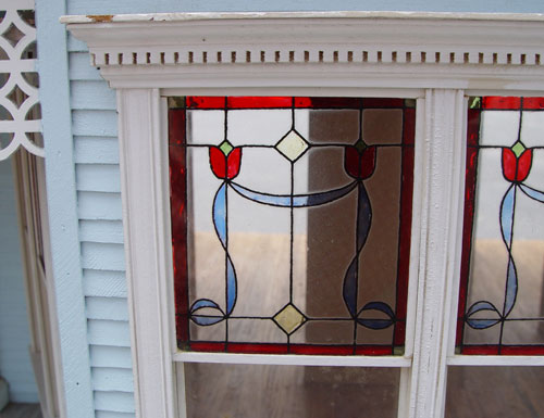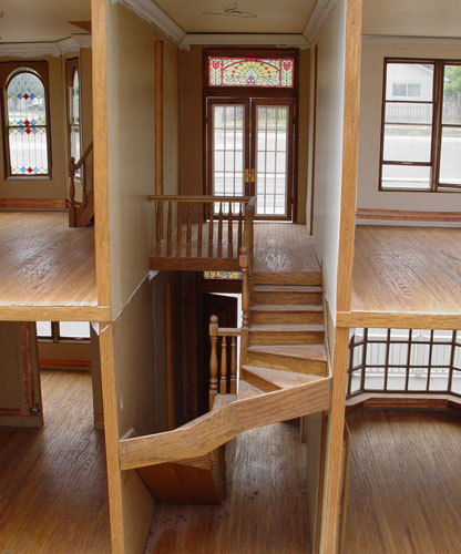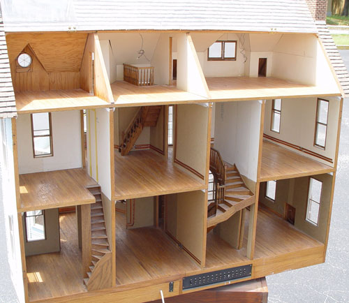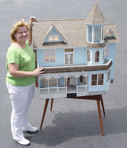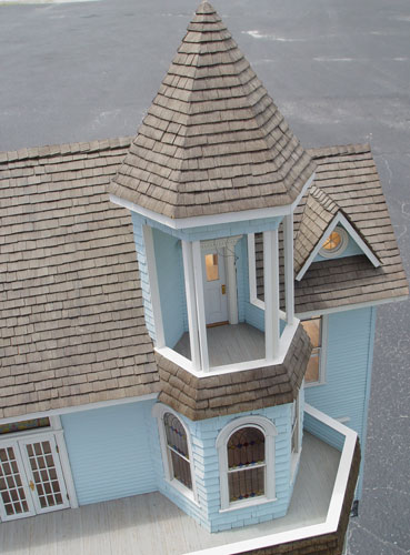HUGE VICTORIAN STYLE DOLLHOUSE: High quality wood dollhouse with gingerbread details, wood siding and shingle roof, brick chimney. ''Stain'' glass windows open and close, as do the doors. Two large porches with railings. 3 story, 9 rooms plus 2 landings. Has been wired, but may need some work there. Mounted on a revolving table top. Estate found, mid 20th C. 48''h. x 46 1/2'' x 28 1/4''.