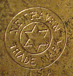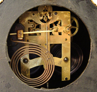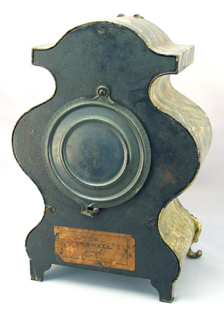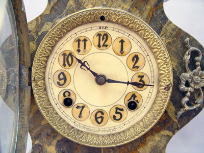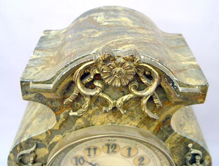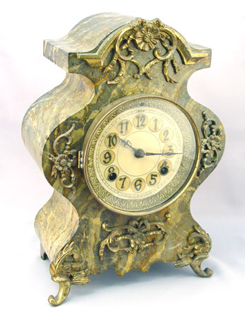 NEW HAVEN TYNDALL FAUX MARBLE MANTLE CLOCK: Metal case painted with faux green marble look. Marked New Haven Trademark on works and paper tag on back 216 ''Tyndall Malachite New Haven Clock Co. USA''. Key and pendulum. 5 1/2'' plastic face with Arabic numbers. Measures 13'' high x 9'' across x 5 1/4'' deep. Please note scratches and minor chips to finish.
