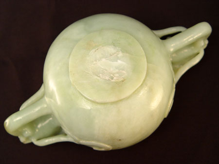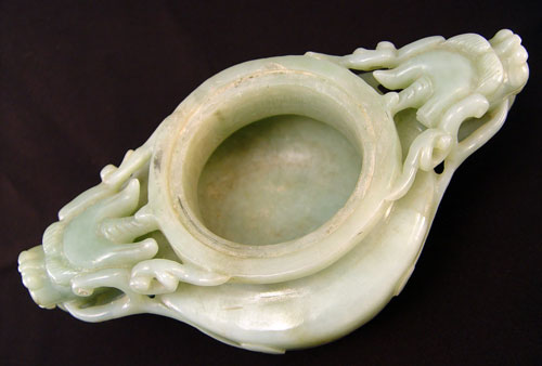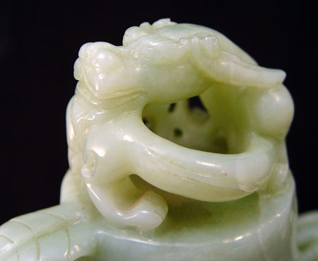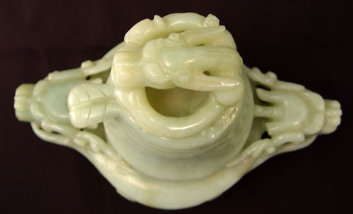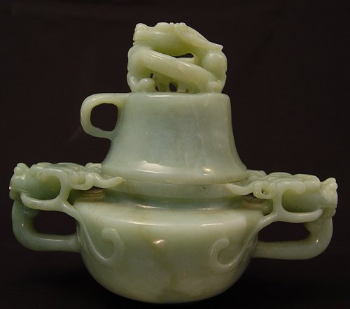 CHINESE CARVED FIGURAL DRAGON JADE CENSOR: Carved lid with figural dragon and leaf design handle. Base has carved dragon handles with scrolls on body. Please note inner rim chips. Measures 7 1/2 high overall x 9'' wide.