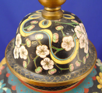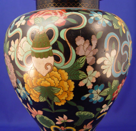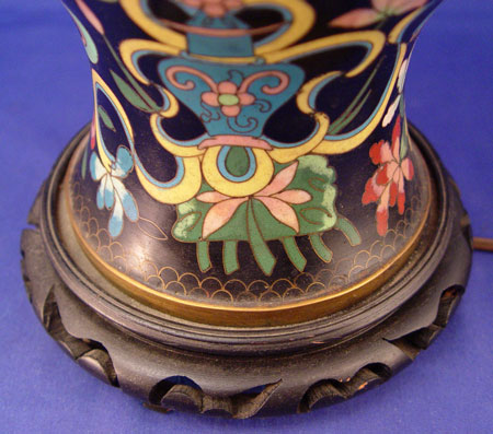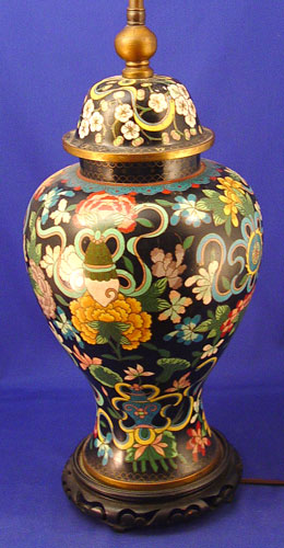 CHINESE CLOISONNE LAMP: Black ground with multi color decor. Converted from a ginger jar. Double socket. Lamp is 30'' high overall.