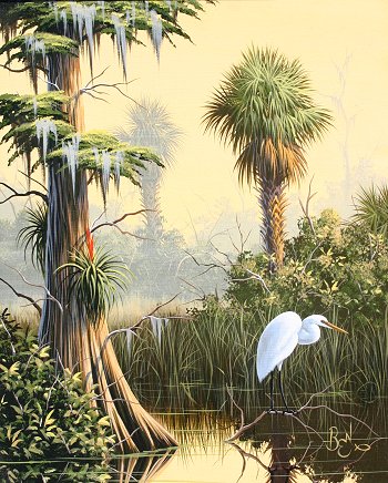 ESSENBURG, Ben, (American, 20th C): ''Sunday Morning'', white heron in cypress swamp, Acrylic/Canvas, 20'' x 16'', signed, signed and titled verso.