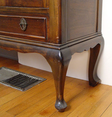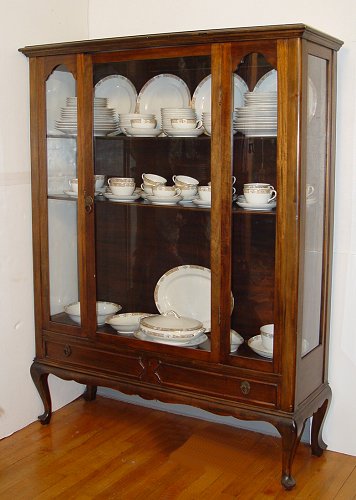 1930'S MAHOGANY CHINA DISPLAY CABINET: Glass front and sides. Single door, 2 shelves. Full length drawer across bottom, cabriole legs. 60 1/2'' high x 46'' wide x 15'' deep.
