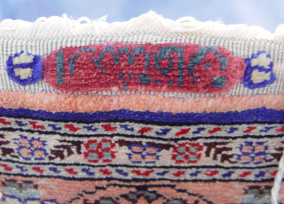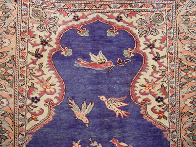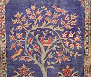 SILK HAND TIED TREE OF LIFE RUG: Royal blue ground. Rings and rod for wall hanging. Approx. 38'' x 23 1/2''.