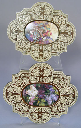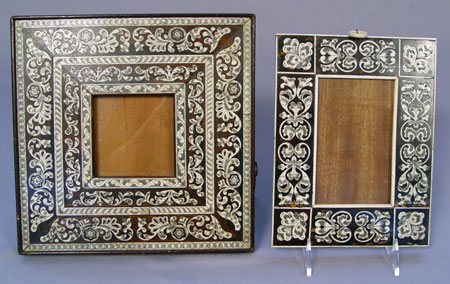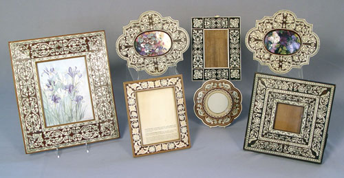 COLLECTION OF 7 BONE AND IVORY INLAY PICTURE FRAMES: 4 are rectangular, 3 are shaped and hold oval or round pictures. The largest is 12 x 14'', smallest is 6 3/4'' dia. Combination of easel back and wall hanging frames.