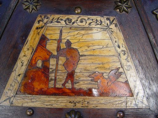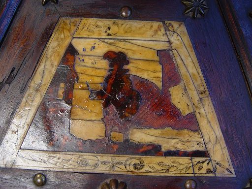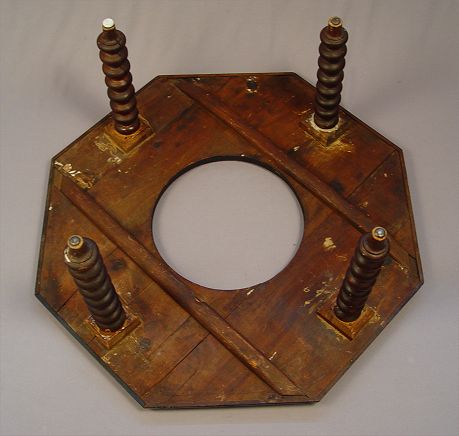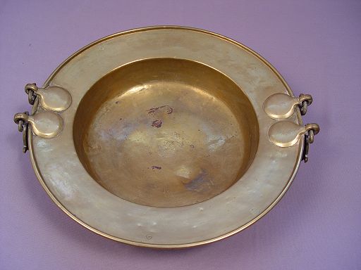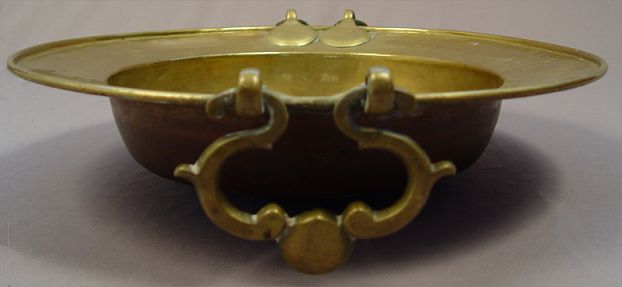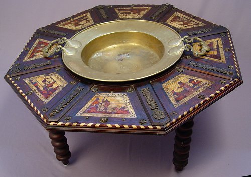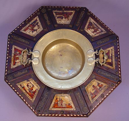 19TH CENTURY BRAZIER WITH INLAID SCENIC PANELS AND BRASS HANDLED CENTER DISH: Octagonal table with bone and wood inlay genre scenes centering an 18'' dia. brass bowl. Star, rosette, and fleur de lis metal accoutrements decorate the table. Please note loss of inlay and repair to leg. 33'' dia. x 15''h.