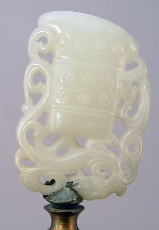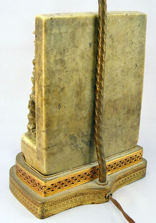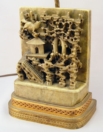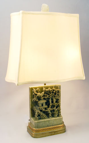 CHINESE CARVED SOAPSTONE LAMP: Carved stone on tiered brass base, jade? finial. 21 3/4'' high overall.