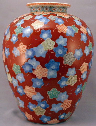 POLYCHROME CHINESE VASE: Ox blood ground with polychrome leaf design, under glaze mark to bottom, approx. 13''h. and 9''dia at widest.