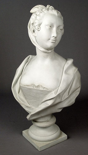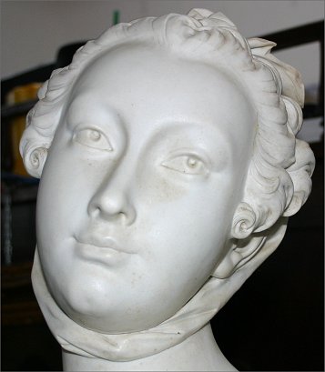 19TH C? BISQUE SCULPTURE OF A YOUNG PROUD MAIDEN: Unsigned, approx. 26'' high, 14'' wide and 30lbs. Several areas of visible shrinkage and two chips to the base, needs cleaning.
