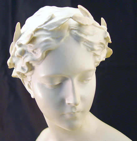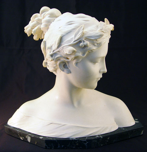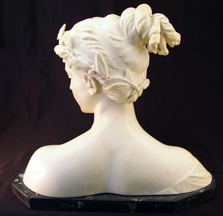 POESIE, CAST SCULPTURE BY PROF. GARELLA: Bust of a woman, 13 1/2'' high, 15'' wide, sits on a faux (false painted) marble base, unknown material, incised signature, please note damage to wreath.