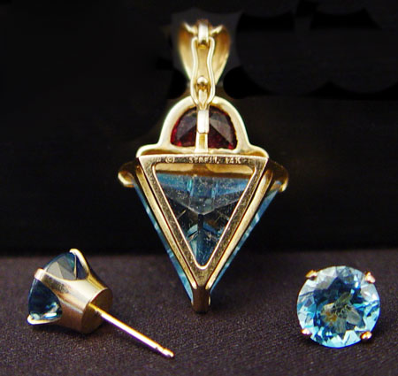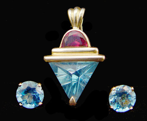 BLUE TOPAZ & GARNET ENHANCER PENDANT AND TOPAZ EARRINGS: 14K yellow gold enhancer pendant with triangle fantasy cut 5.00 ct blue topaz. Moon shaped mixed cut garnet approx. 1.50 Ct. 14K yellow gold earrings with 2 8.00 mm round mixed cut blue topaz approx. 2.00 CTW. Weight: 7.3 grams.