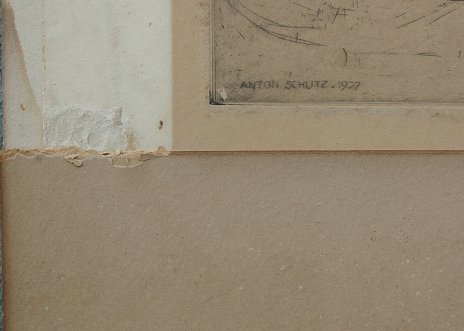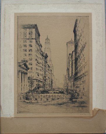 SCHUTZ, Anton, (American, 1894-1977): Park Ave New York City, Dry Point Etching, overall 18'' x 13 3/4'', pencil signed, signed in the plate, dated 1927, unframed. Laid down with lower portion of mat still affixed to the print, partial tear in lower left margin, sold as is.