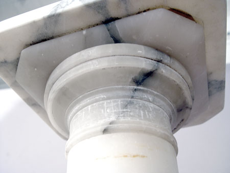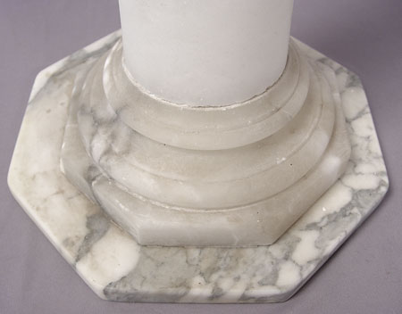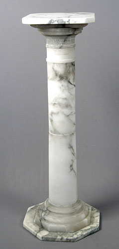 WHITE MARBLE PEDESTAL: 39''h., 15'' octagonal base, 11 1/2'' square top. Breaks down for ease in transport.