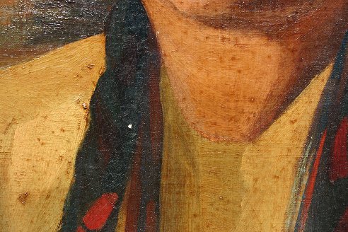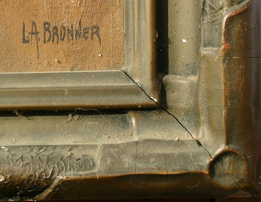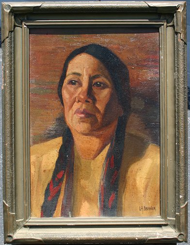 BRUNNER, Lawrence A., (American, 1883-): Portrait of an Indian Maiden, Oil/Board, 20'' x 14'', signed, period gilded and carved frame with wear and missing gesso, 25'' x 19 1/2''. Needs cleaning, some cracklure in her hair with paint fleck.