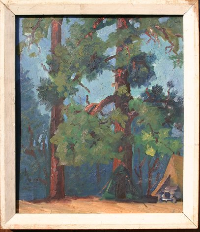 BRUNNER, Lawrence A., (American, 1883-): Camping in the Redwood Forest, Oil/Canvas, 14'' x 12'', white frame with wear, 15 1/2'' x 13 1/2''. Needs cleaning.