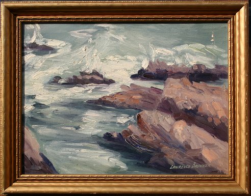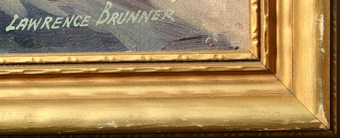 BRUNNER, Lawrence A., (American, 1883-): Carmel Coast, Oil/Canvas Board, 12'' x 15 3/4'', signed, over-painted gold frame with wear, 14'' x 18''. Abrasion in upper right corner with paint fleck.