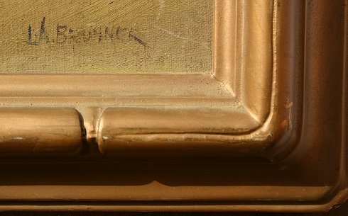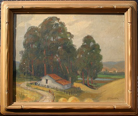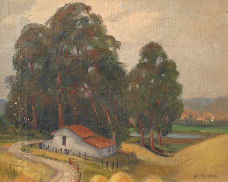 BRUNNER, Lawrence A., (American, 1883-): California Landscape with Eucalyptus, Oil/Canvas, 16'' x 20'', signed, period carved impressionist frame with over paint, 20'' x 24''. Several abrasions and fleck throughout, needs cleaning.
