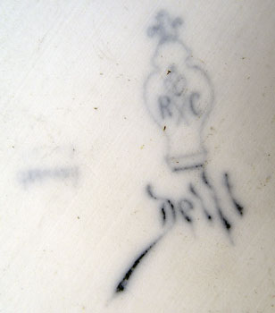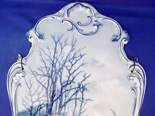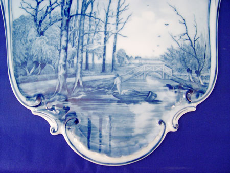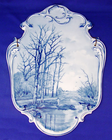 DELFT BLUE AND WHITE PORCELAIN PLAQUE: River landscape, 19'' x 13''. RC Crown mark.