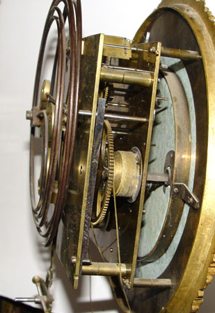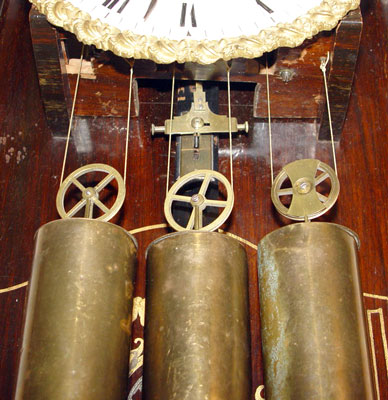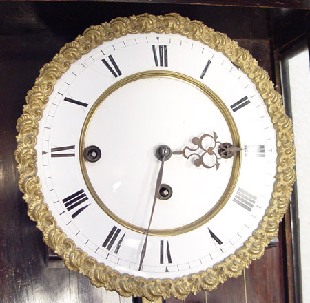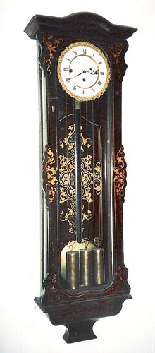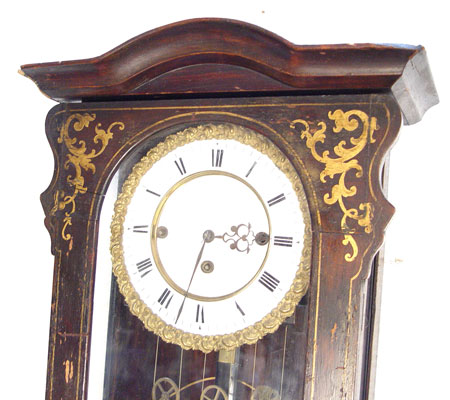 19TH CENTURY HAND PAINTED WALL CLOCK: Solid wood case with glass front and sides. Hand painted decoration on sides, front and behind pendulum. Porcelain dial with Roman numerals, unmarked. Weight driven with key and pendulum. Measures approx. 43 1/2'' high x 14'' wide x 6'' deep. Please call for condition.