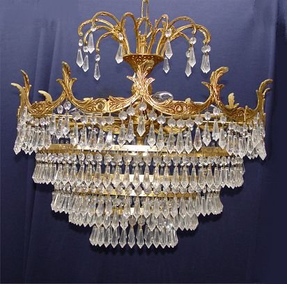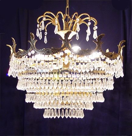 5 TIER CRYSTAL CHANDELIER: 6 lights masked by 5 tiers of crystal prisms. 20'' dia. hangs 19''.