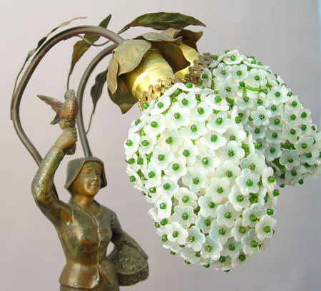 FRENCH ART NOUVEAU FIGURAL LAMP WITH GLASS SHADES: Art nouveau style figure of woman holding basket with bird in raised hand. Patinated metal, on base with children in wheat field decoration. Vines with flower design over top of figure hold 2 lights. Expanding wire shades with glass flowers and beads. Marked '' La Cueillette'' Par Marceau. Also marked Made in France. Measures 21'' high overall.