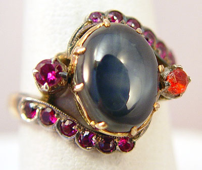 5.00 CT. STAR SAPPHIRE AND RUBY RING: 14K yellow gold ring with approx. 5.00 Ct. oval cabochon cut star sapphire, dark blue in color, 6 ray off center star. 13 round mixed cut rubies. Approx. .25 CTW. One round unidentified red stone has replaced a missing ruby. The stones are prong set. Weight: 4.6 grams. Size 6.5