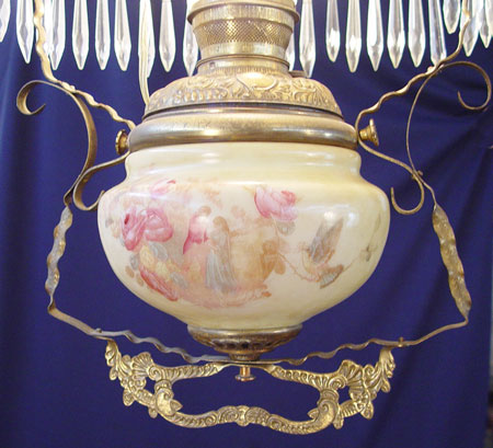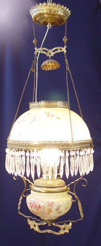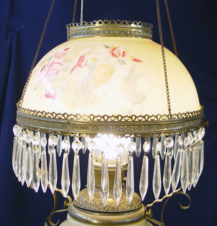 VICTORIAN CEILING LAMP: Converted to electricity from an oil lamp. Hand painted matching font and 14'' shade. Brass frame. Hangs 28''. Complete with smoke cap and prisms.