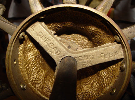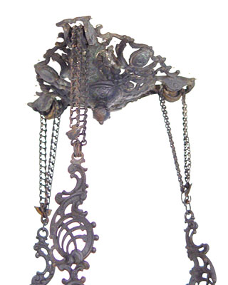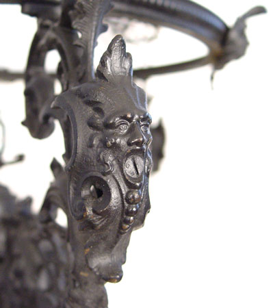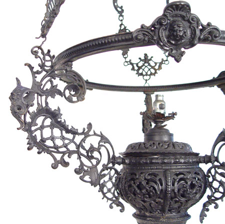 ORNATE VICTORIAN IRON CHANDELIER: Intricate chain supports with masquerons and cupid heads decorating the frame. The glass font is intact and the lamp can be used for oil again. Will hold a 16'' shade. Hangs 47''.