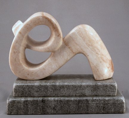 BIOMORPHIC PINK MARBLE SCULPTURE SIGNED R.T. MORGAN: Affixed to polished stepped grey granite base, overall 8 1/2''h., 10''w.