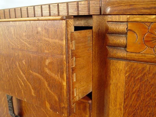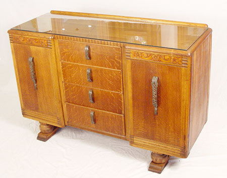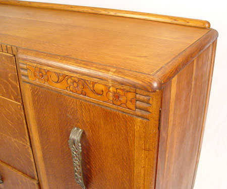 1920'S ENGLISH CARVED OAK SIDEBOARD: Four central drawers flanked by cabinet doors. 35''h. x 54'' x 20''.