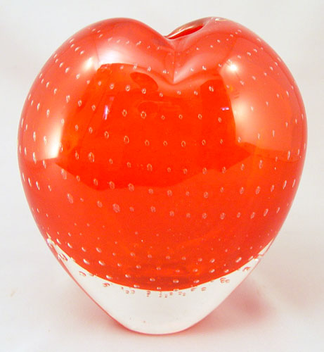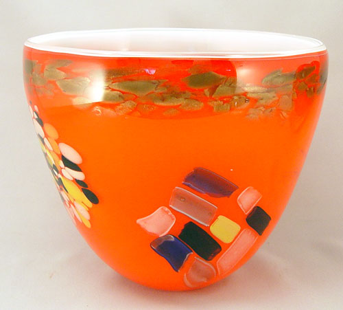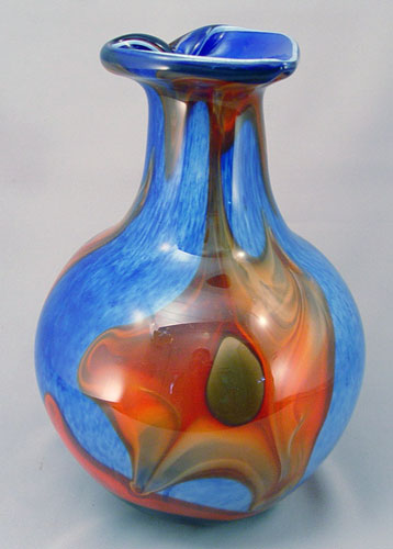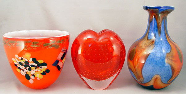 3 PIECE MODERN ITALIAN ART GLASS: To include 1) Heart shaped flower vase with red and clear glass. 7 3/4'' high, unsigned. 2) Lux Vetreria orange background, large bowl with polychrome geometric designs. 7'' high x 8 1/4'' top diameter. 3) Blue / white background with orange and browns design pitcher. 11'' high. Made in Italy sticker. No chips or cracks on all.