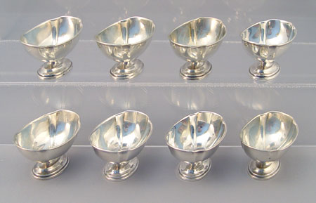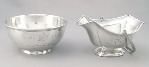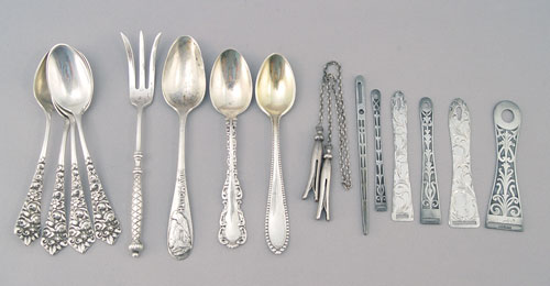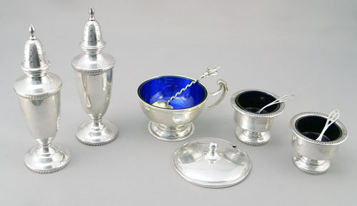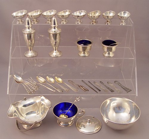 ESTATE LOT OF STERLING ITEMS- SALTS BOWL TRINKETS: To include Fisher salt & pepper 5 1/2'' high, 8 Webster open salts 1 3/8'' high, unidentified covered sugar with cobalt glass insert 2 3/4'' high, Shreve, Crump & Low presentation bowl with etched presentation 1910 2'' high x 4 1/2'' dia., monogrammed Webster waste basket with hinged handle 3'' high, 2 Fisher open salts with cobalt glass inserts 1 3/4''. Also included is 6 assorted demitasse spoons, Plymouth Rock souvenir spoon, Twist handle heart shaped bowl sugar spoon, 2 salt spoons, 6 sewing implements, bookmark chain with 2 small clothespins. Approx. 23.6 troy oz.
