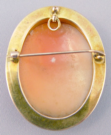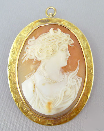 LARGE CARVED SHELL CAMEO PENDANT BROOCH: Diana, Roman goddess of the hunt and the moon goddess, framed in 10K gold, 1 7/8'' oval.
