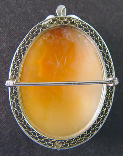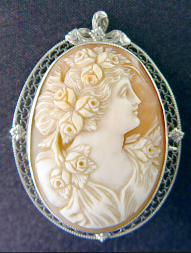 14K SHELL CAMEO BROOCH: 14K white gold shell cameo depicts a female bust. Filigree and applied bow and flora. Bar pin closure. 1.5 x 1.25''