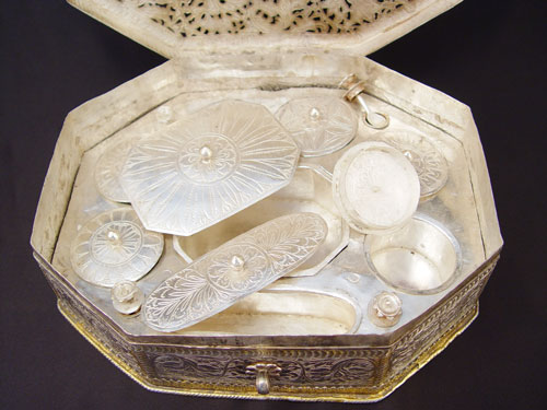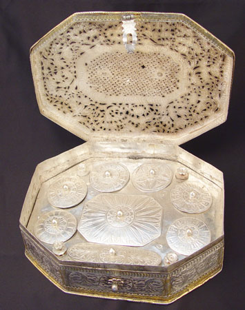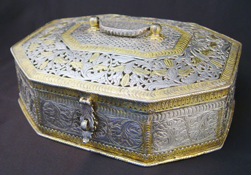 INDIAN PIERCED SILVER AND BRASS BOX: Interior fitted with 8 boxes and covers and 4 very small scoops. Octagonal shape with hinged top. Actual metal unknown. 3''h. x 9 1/2'' x 8''.