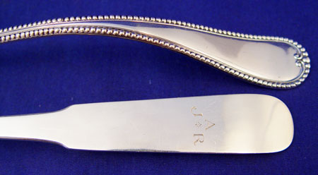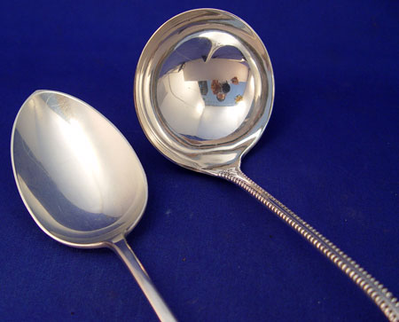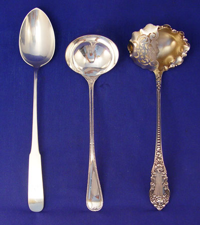 3 PIECE NEWBERRY CRAFTERS AND BIXBY STERLING PUNCH LADLE AND SPOON: To include 1) Old Newbury Crafters sterling serving spoon 12 3/4'' long. Monogrammed. Approx 4.1 troy oz. 2) Unique Bixby Silver Co. sterling straining punch ladle 11'' long. Approx 5.9 troy oz. 3) William Rogers silverplate gravy ladle 10 3/4'' long.
