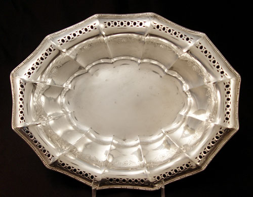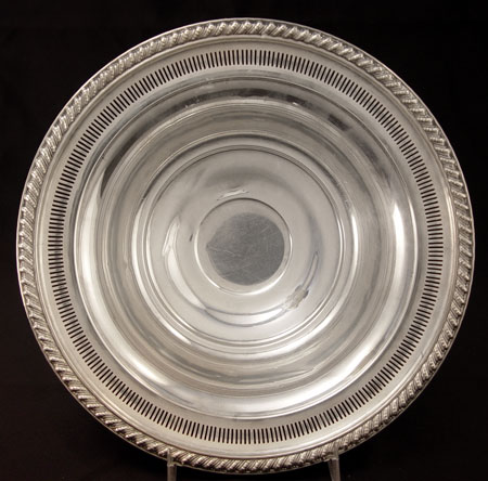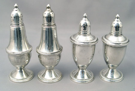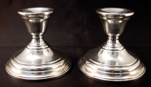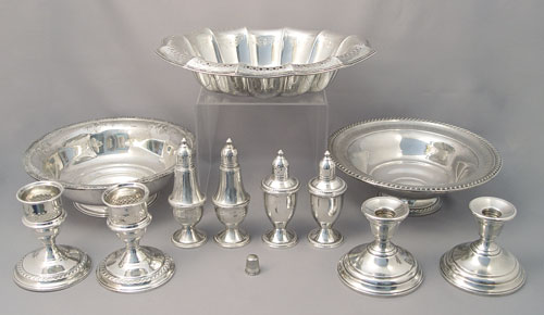 ESTATE ACCUMULATION OF STERLING SILVER BOWLS AND SHAKERS: To include 1) Gorham serving bowl with open work edge and engraved decoration, inscription on bottom (2 1/4'' high x 10 1/2'' x 8 1/2''), approx. 12 troy oz.. 2) Fisher ''Rose Bouquet'' serving bowl (2 7/8'' high x 9'' dia.), approx 7.4 troy oz, note condition. 3) Rogers weighted reinforced sterling serving bowl (3'' high x 9'' dia.). 4) Pair Duchin salt & pepper weighted (5 3/8'' high). 5) Pair Duchin salt & pepper weighted (4 3/4'' high). 6) Pair International Berkley design weighted candle holders (3 1/4'' high x 3 3/4'' base dia.). 7) Pair N.S. Co. weighted candle holders (4'' high x 3 1/2'' dia.). M K & G sterling thimble, approx. 1.5 troy oz.. Approx. total sterling 20.9 troy oz.