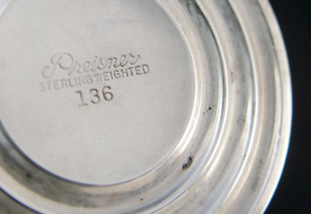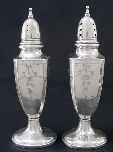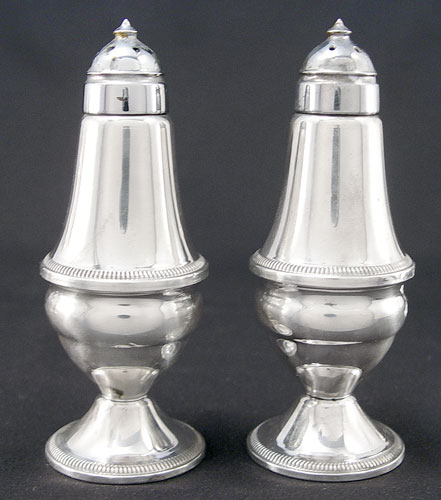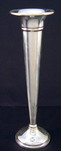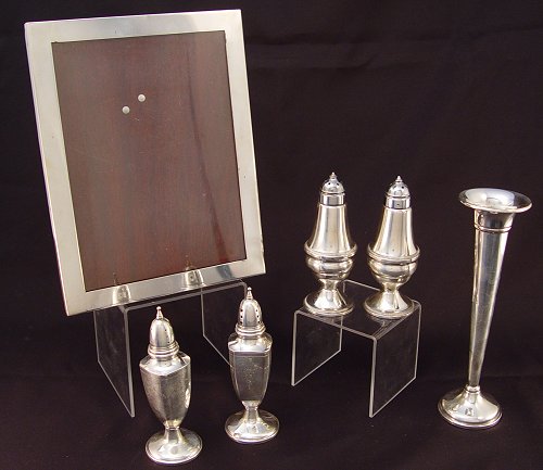 ESTATE STERLING LOT FRAME, VASE, SALTS: To include Gorham sterling picture frame, 6 3/4'' x 8 3/4'', approx 2.4 troy oz. Preisner weighted bud vase 7 1/2'' high, note small dings. Duchin weighted salt and pepper 4 3/4'' high. HGSCO weight filled salt and pepper 5'' high.