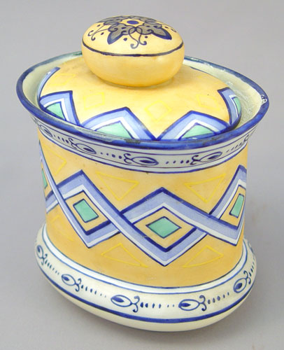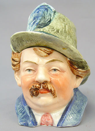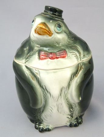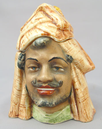 COLLECTION OF 5 FIGURAL TOBACCO JARS: 1) Penguin, 7''h. 2) Figural man, 5'' 3) Geometric Nippon, 4'' 4) Large Arabic man, 7''h. 5) Small Arabic man, 5''. Please note the large Arabic man and the Nippon have a hairline.