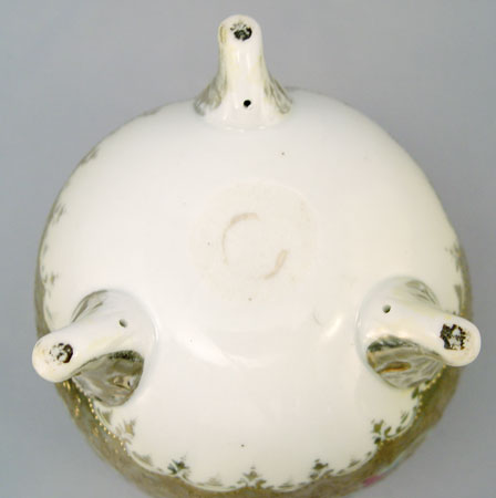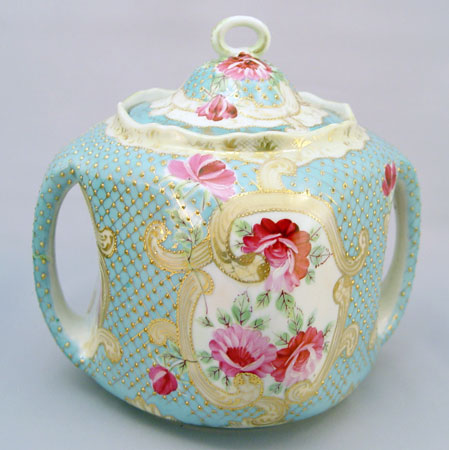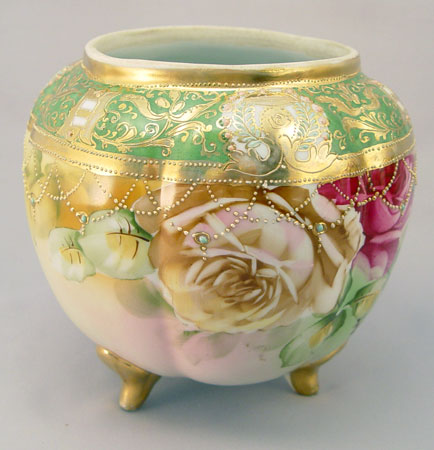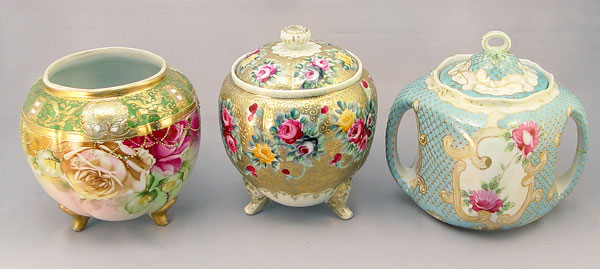 3 HAND PAINTED ROSE DECORATED NIPPON BISCUIT JARS AND ROSE BOWL: 1) Rose bowl is melon ribbed, on three scroll feet, 6''h. Maple leaf mark. 2) double handle biscuit jar, unsigned, repair to handle, 7''h. 3) Most ornate with roses on gold, scroll feet, wear to the gold on feet and finial, 7 1/2''h.