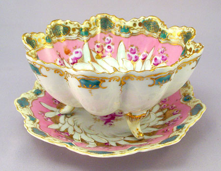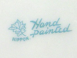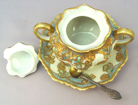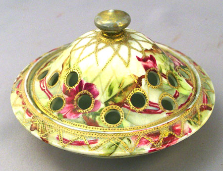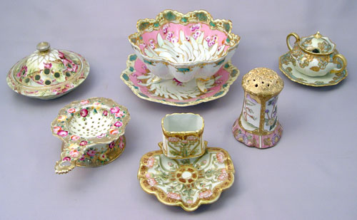6 PIECE COLLECTION OF ORNATE HAND PAINTED NIPPON PORCELAIN: 1) Mustard jar, signed. 2) Match Holder ashtray, maple leaf mark 3) Rose bowl flower frog, maple leaf mark 4) Muffineer or hat pin holder, Morimura Bros. mark 5) Strawberry bowl with underplate, unsigned. 6) Lemon strainer with holder, note repair to handle.