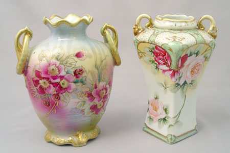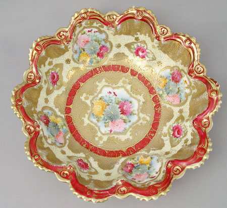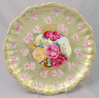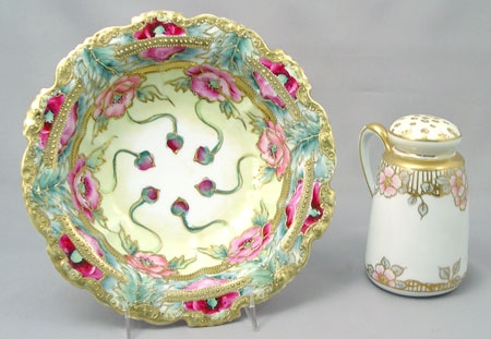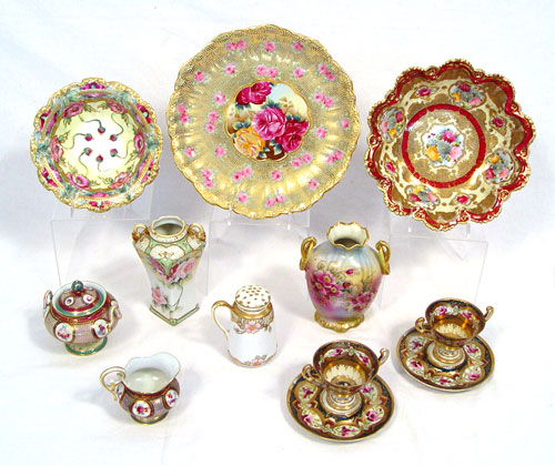 ESTATE FRESH HAND PAINTED ROSE DECORATED NIPPON PORCELAIN COLLECTION: 10 pieces to include, 1) Large 12'' dia. decorated charger with turquoise enamel beading 2) Scallop rim bowl, 11'' dia. 3) an 8 1/2'' dia. bowl 4-5) Creamer and sugar with gold beading, 6) Muffineer with handle, 7) a 6 3/4'' vase with ring handles 8) 7'' vase. 9-10) A pair of Royal Nippon double handle cups and saucers, one with repair to cup.