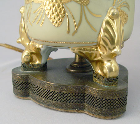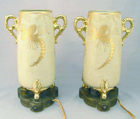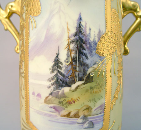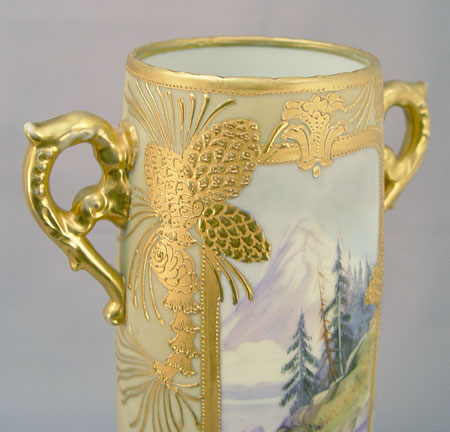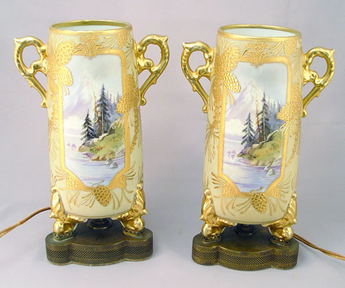 PAIR NIPPON PORCELAIN LAMPS: Matched pair of table top torchieres. Hand painted pine tree and mountain scene framed in gilt pine cone decoration. 11'' high x 7'' wide overall. Nippon attrib.