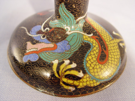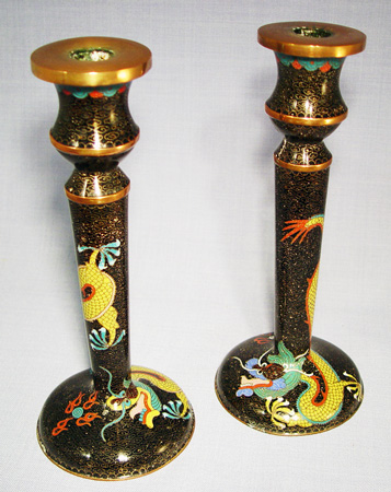 PAIR OF CHINESE CLOISONNE DRAGON DESIGN CANDLE STICKS: Black ground, 10 1/4'' h., 4 1/4'' dia. base.