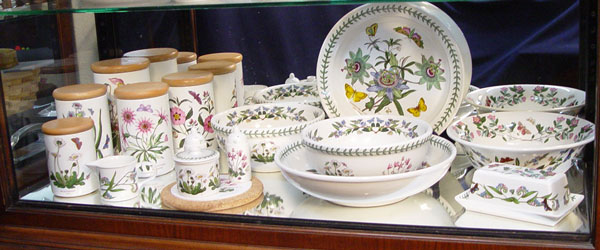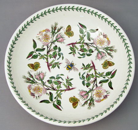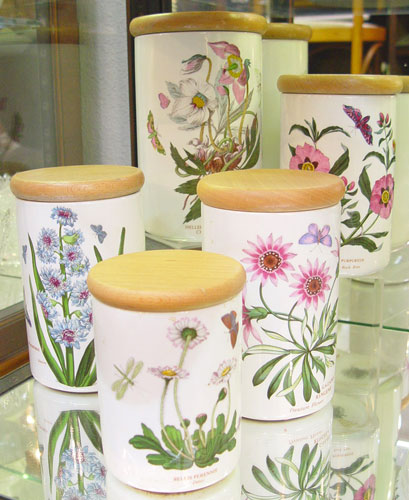 LOT OF PORTMERION BOTANICAL GARDEN SERVING PIECES: 15 pieces to include a 5 piece canister set, cream pitcher, sugar, salt and pepper, covered butter dish, an 11'' dia. bowl, a 9'' dia. bowl, a 9 1/4'' dia. bowl, a 12 3/4'' dia. bowl, and a quiche plate.