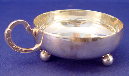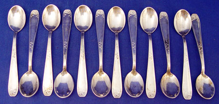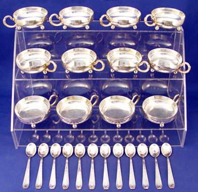 BRAZILIAN BELPRATA SILVERPLATE SORBET SET IN CASE: To include 12 small sorbet bowls with 3 round feet (1 1/2'' high X 3 1/2'' dia.). Also included are 12 dessert spoons 5'' long. Comes cased in box marked Belprata, a Brazilian silver maker. Please note scratches in bottom of bowls and stain in case.