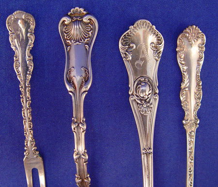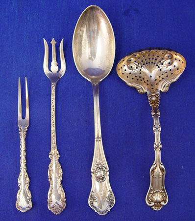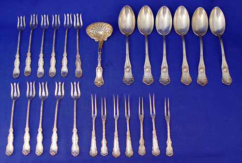 25 PIECE ESTATE LOT WHITING, GORHAM, SIMPSON HALL & MILLER STERLING FLATWARE: To include 1) Set of 11 Hamilton & Diesinger shrimp forks (5 7/8''). 2) Whiting ''Imperial Queen'' design pierced ladle (5 1/4''). 3) 7 Olive forks, 4 by Whiting, monogrammed (4 3/8''); 4 by Simpson Hall & Miller Co., un-monogrammed (4 3/4''). 4) 6 Gorham tablespoons (6 3/4''). Approx. 15.8 troy oz.